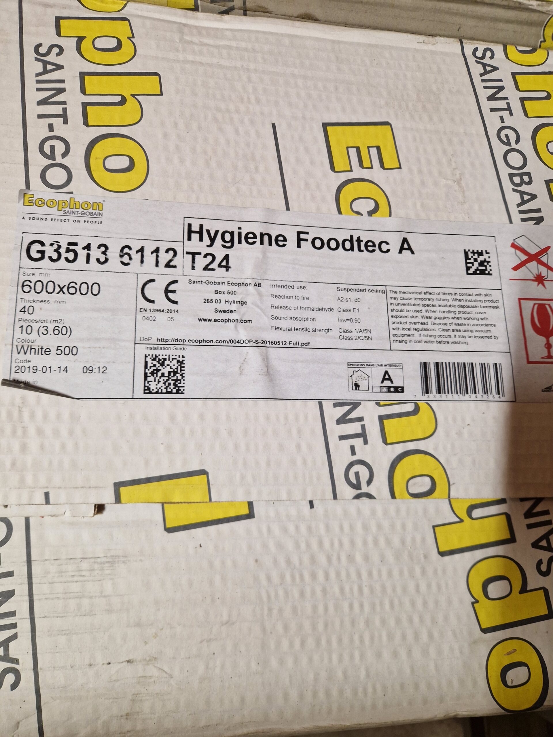 Ecophon Hygiene Foodtec A – 600x600x40mm Vita 10 plattor (3,60 m²)